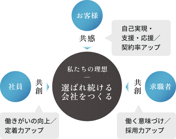 会社のビジョンと個人のビジョンを重ねあわせ、やりがいある人生をおくるために、志を軸とした採用活動を支援します。