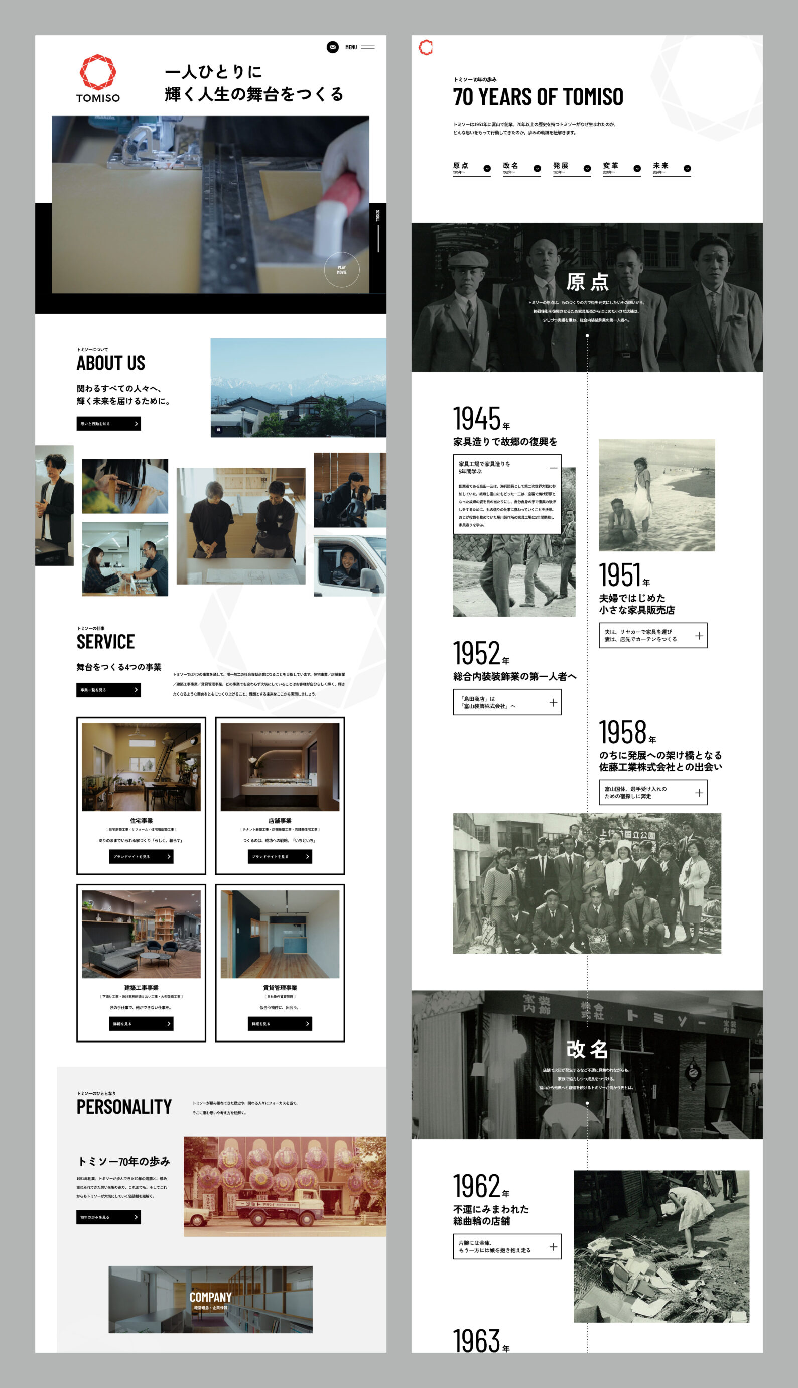 富山県富山市で70年以上の歴史をもつ企業。戦後の復興期から富山でモノづくりをスタートさせて、現在は4つの事業を展開中。またすべての事業において高い技術力をもった工務部が現場を管理することで、多岐に渡るプロジェクトの根幹を支える。今後もさまざまな取り組みで富山の未来を担う。