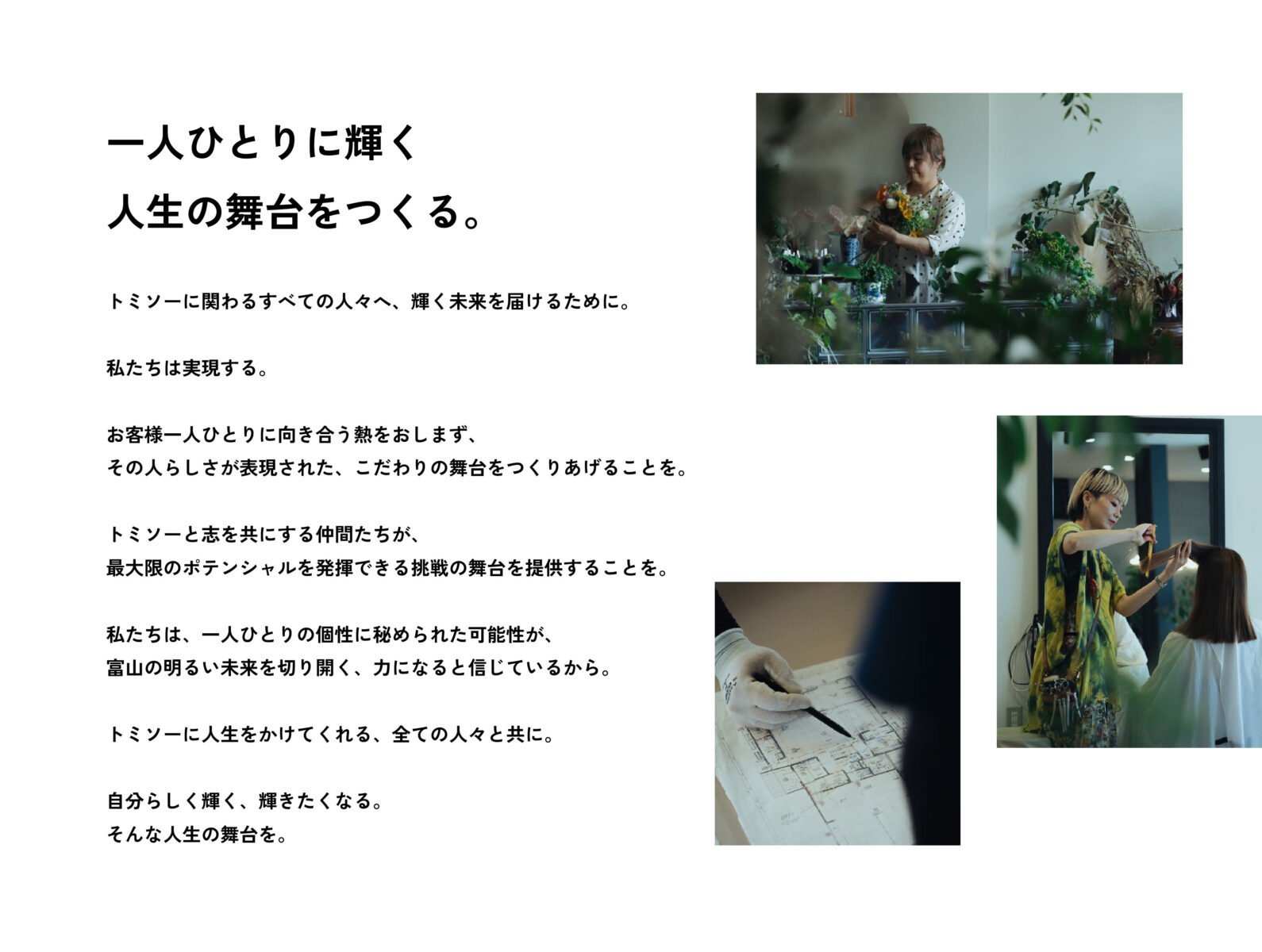 ブランド構築を経てスローガンが決まったことで、会社としての一貫したスタンスを世間の方々に伝えられるようになったのは大きな大きな成果だと言えるかもしれません。各事業にはそれぞれのカラーがありますが、これまでやってこられたことに、一本の軸を通すことができたはずです。またロゴが刷新され、サイトができたこともトミソー様という会社をどう見せていくかの指標となりました。富山の未来を担う企業として、その歩みに少しでも貢献できるよう一つひとつチームで向き合っていきます。