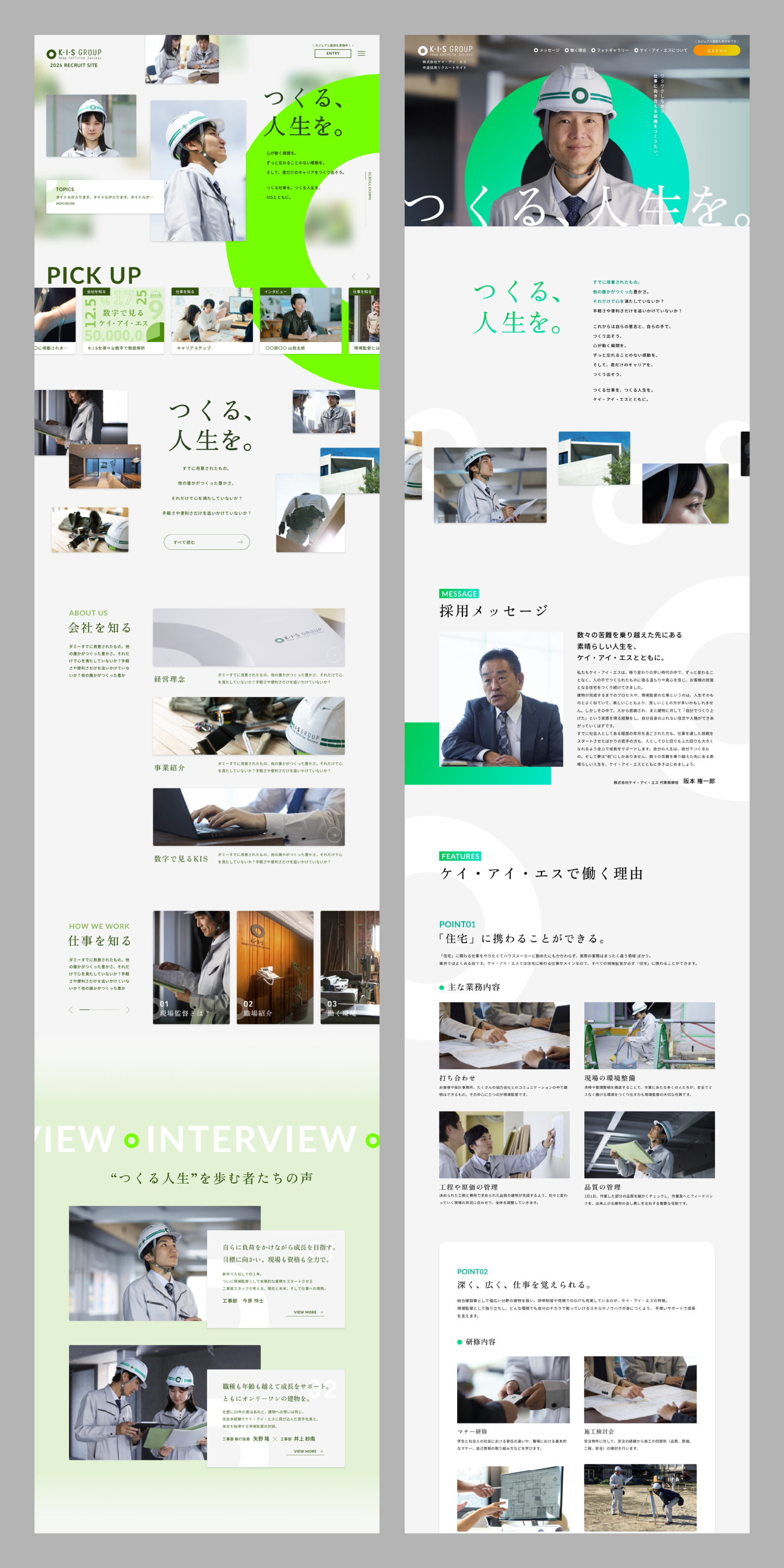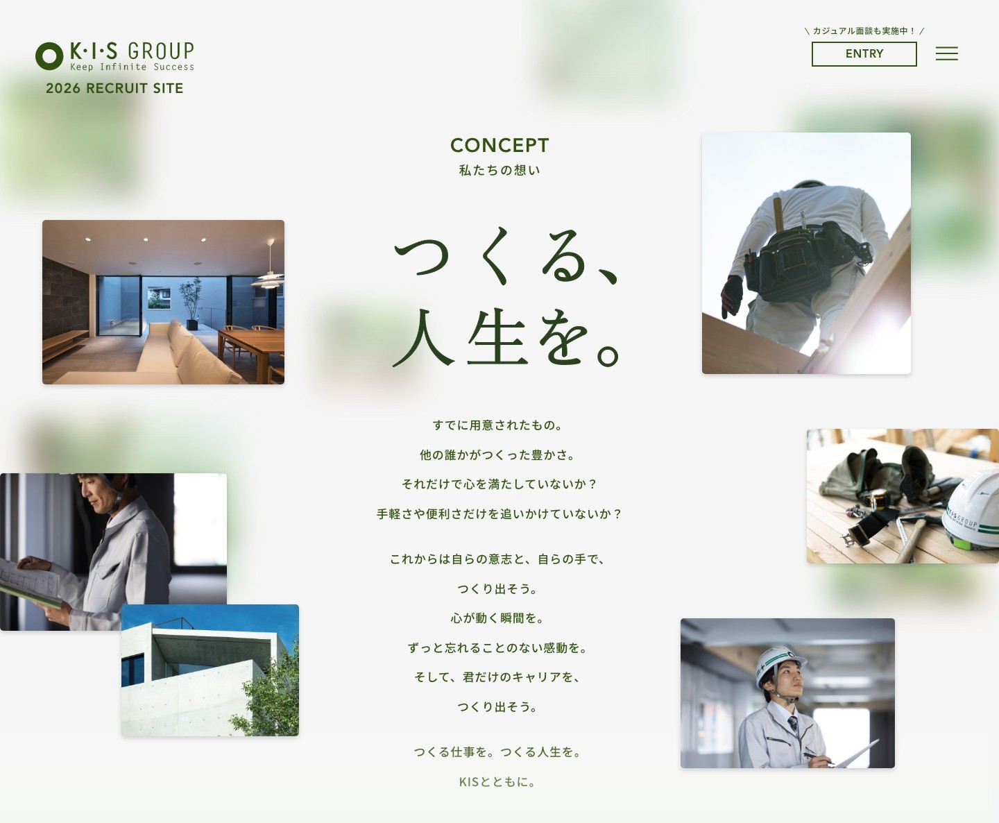 「つくる、人生を。」という採用コンセプトには、ケイ・アイ・エス様が培ってきた人とのつながりや確かな技術力が人を動かし、街を育み、そして働く社員自身の人生も豊かにしていく──そんな想いを込めています。