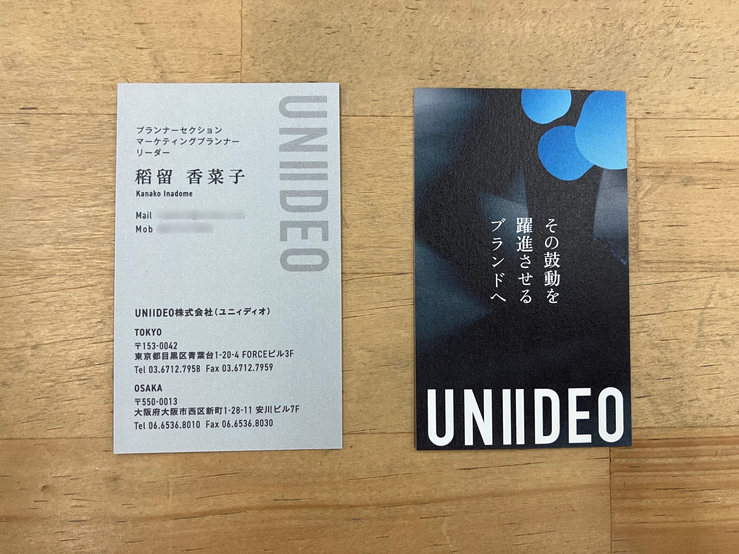 マーケティングプランナーという職種です。育休中にUNIIDEOのリブランディングがあり、名刺デザインも変わりました。