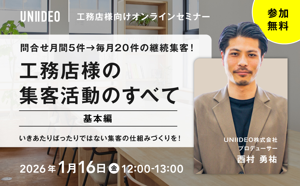 問合せ月間5件→毎月20件の継続集客!工務店様の集客活動のすべて(基本編)【ウェビナー|無料】