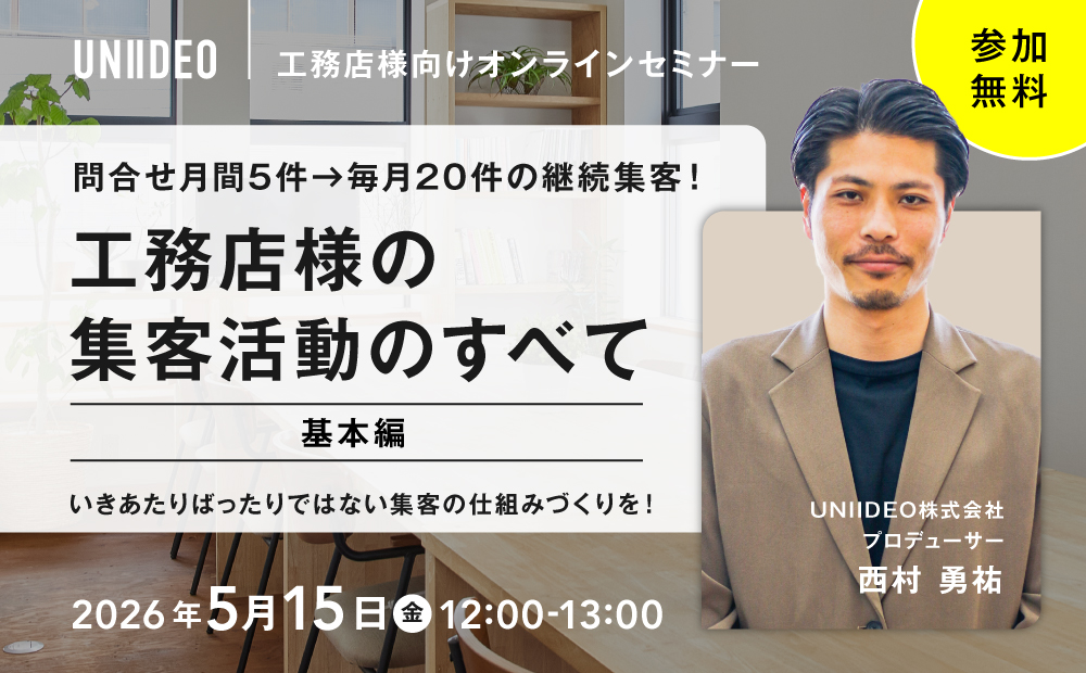 問合せ月間5件→毎月20件の継続集客!工務店様の集客活動のすべて(基本編)【ウェビナー|無料】